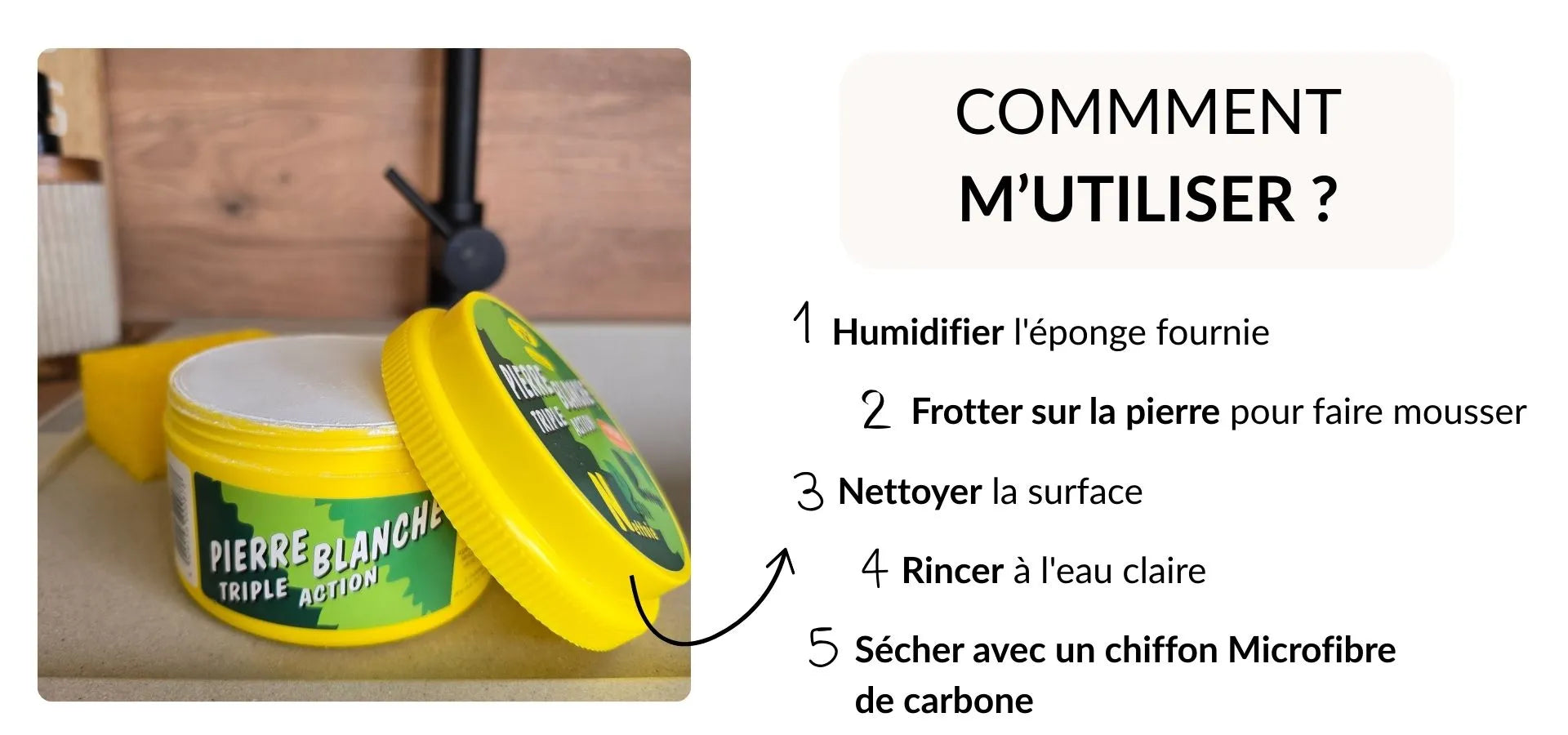 Éponge humide → Frottez sur la pierre → Nettoyez en cercles → Rincez → Brillance immédiate
